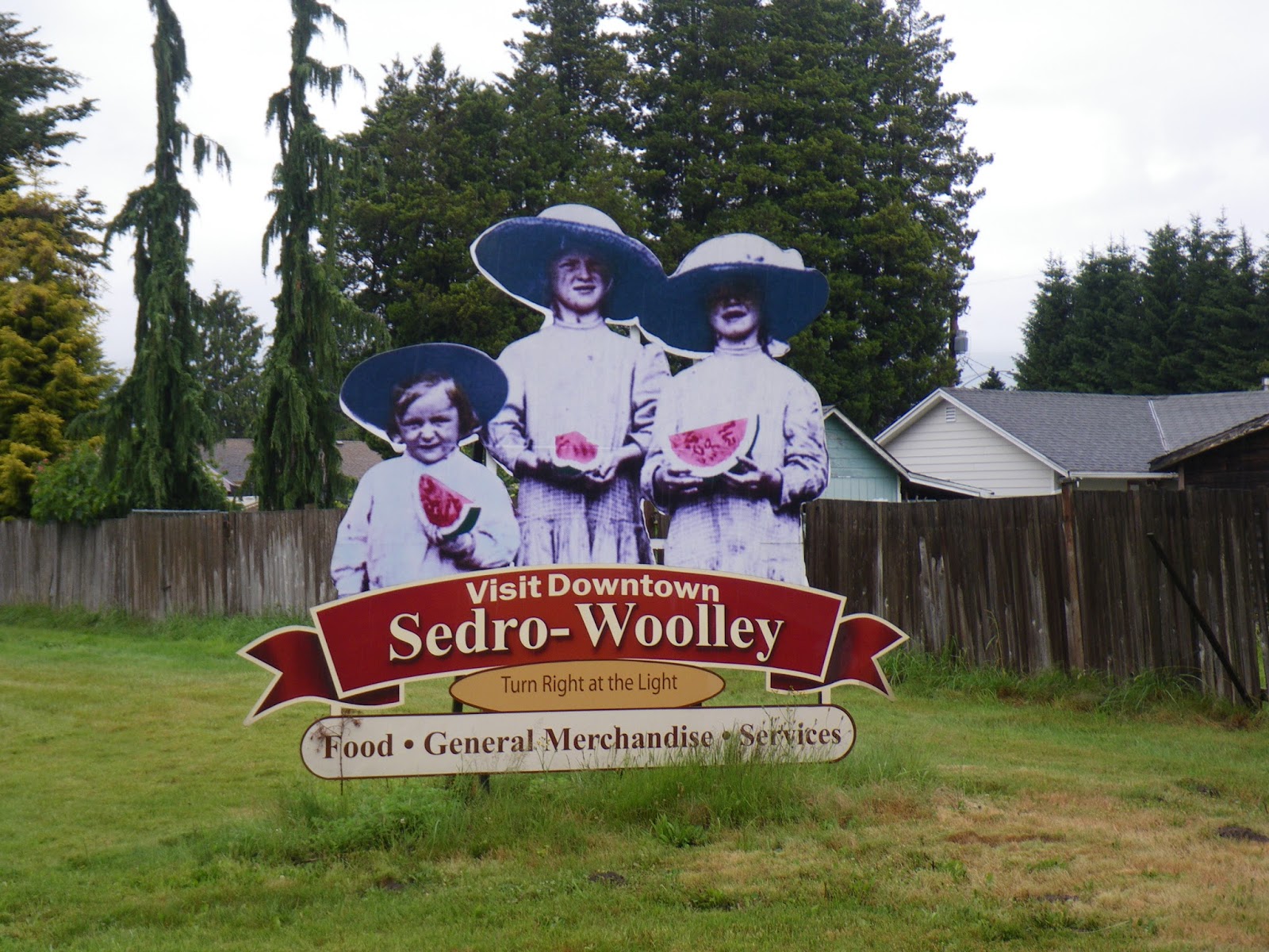 Gotta say I don't really know what sights I missed, as I had my head down a lot - dodging puddles, stones, potholes, etc. We were on backroads most of the day. Plus - very little traffic. Minus - fairly rough chip seal and no shoulders. I only stopped for 2 pictures. One of the Baker River. I'm assuming this originates somewhere on Mount Baker - my favourite mountain of all time. The second pic is a sign coming into our destination town of Sedro-Woolley.